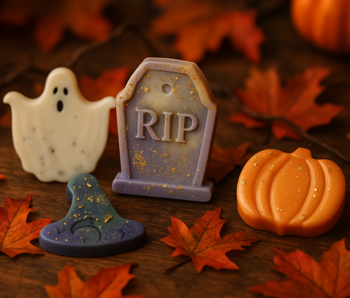 Quatre fondants parfumés, façonnés comme des talismans d’automne pour enchanter vos soirées d’octobre. Chaque pièce est coulée à la main avec une cire de soja 100 % naturelle, des parfums de Grasse sans CMR, sans phtalates, végan et non testés sur les animaux, et des poudres MICA minérales ou colorants européens non toxiques, pour un éclat durable et éthique.