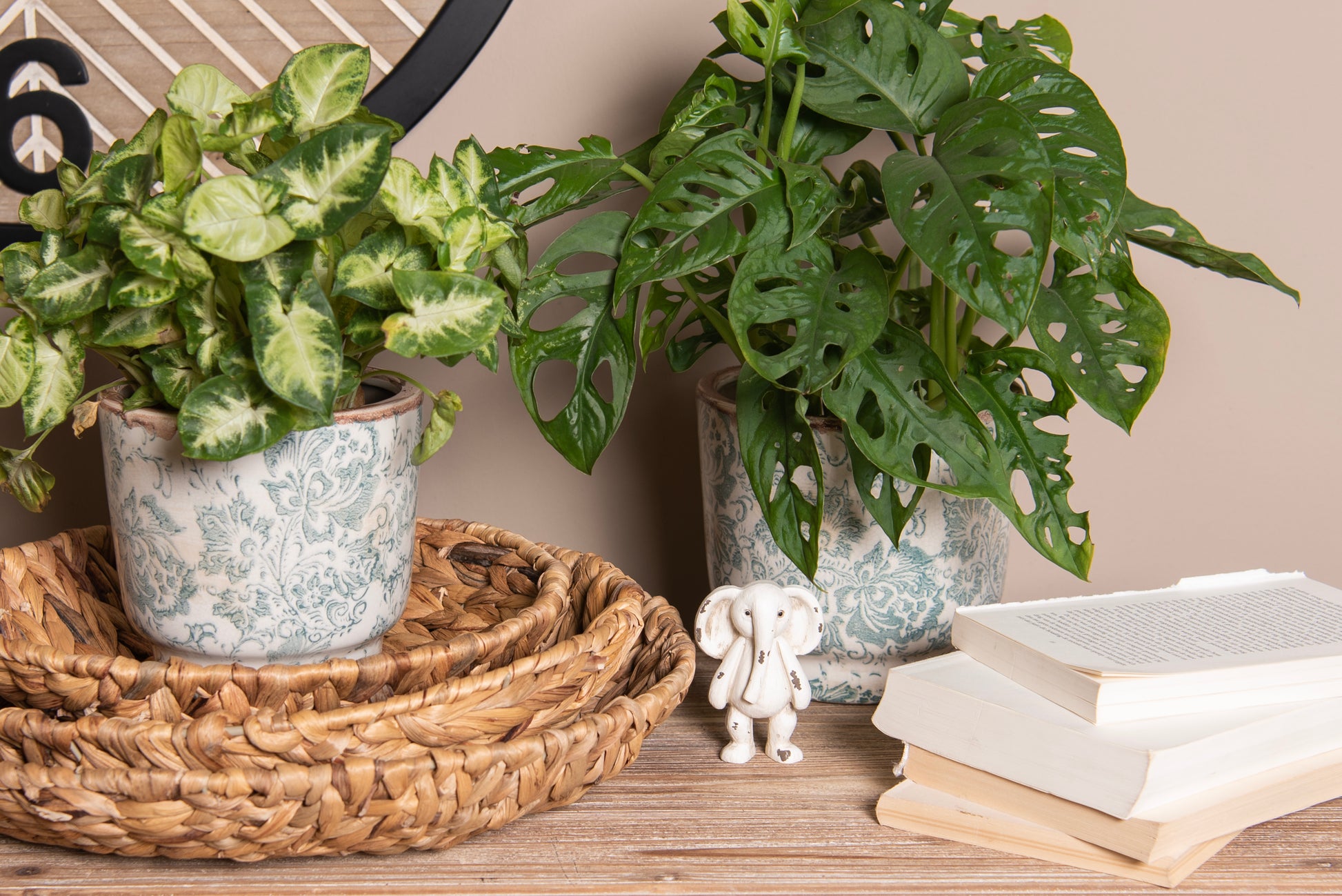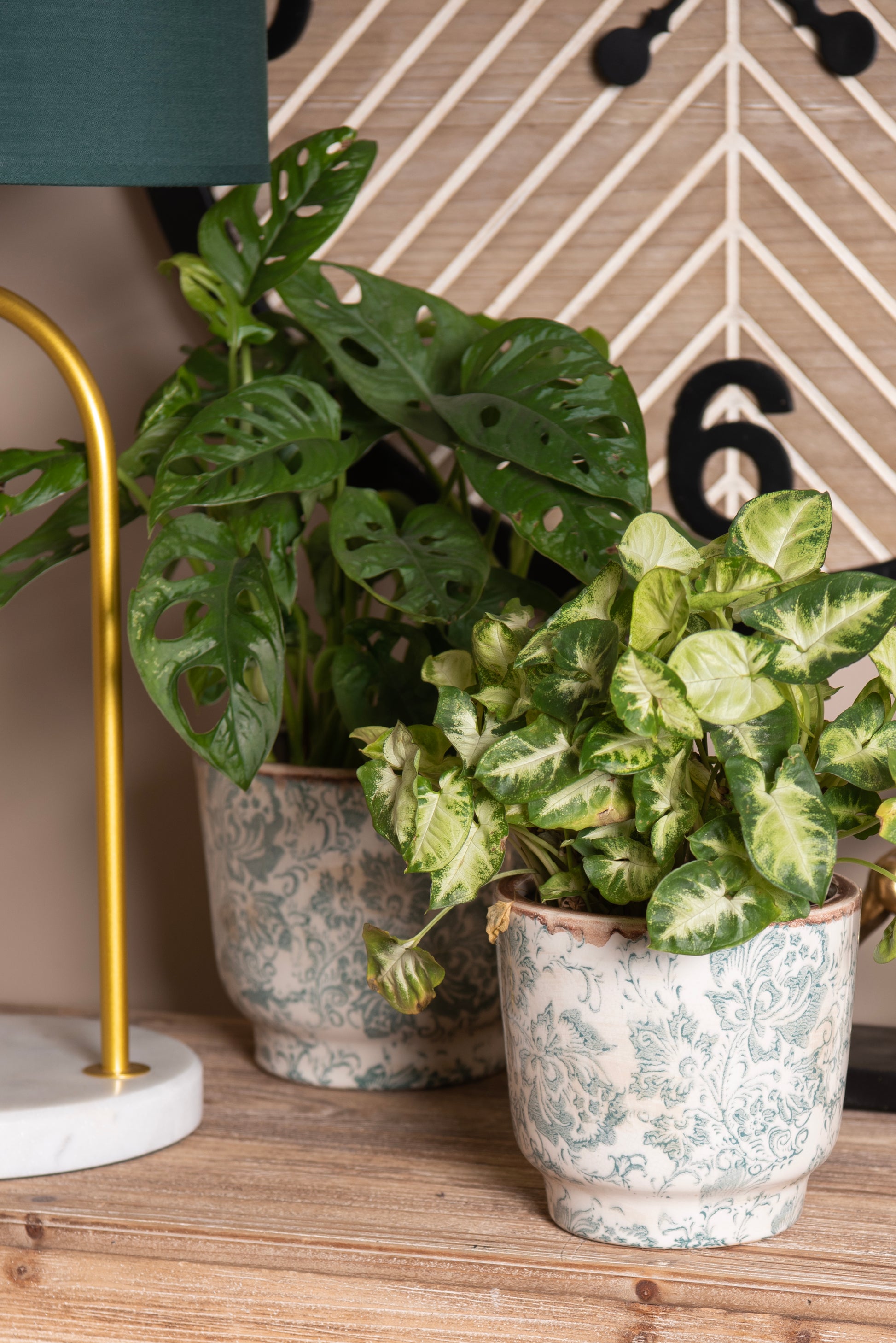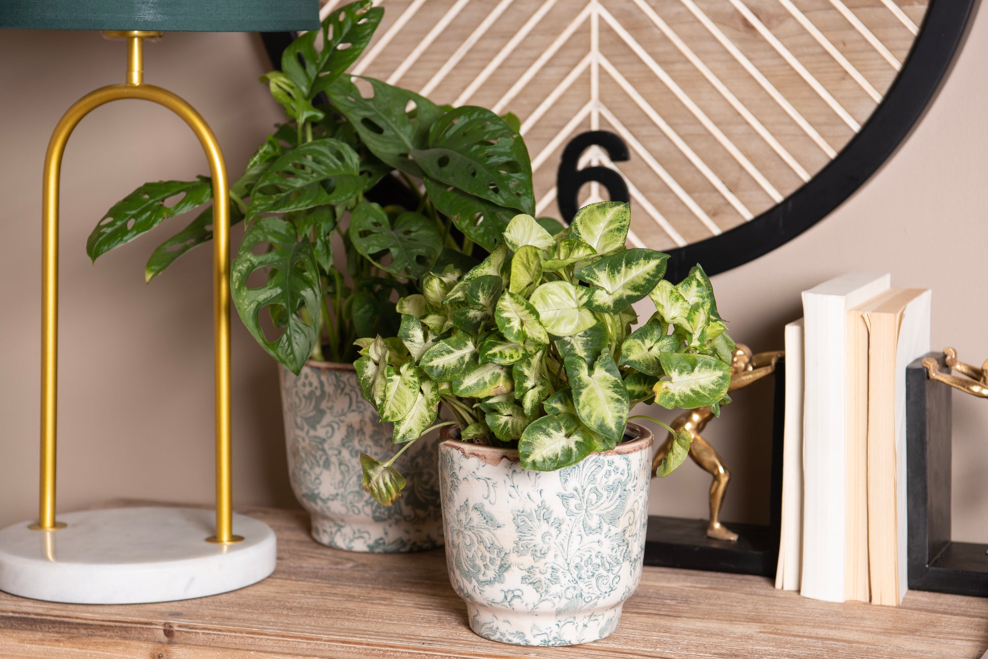Pot de Fleurs en Céramique Beige à Motif Fleuri Vert